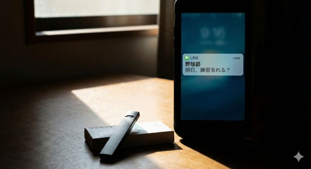 野球部の仲間からのLINEと、隠れて注文した電子タバコ。息子の心が「光と影」の間で揺れている。