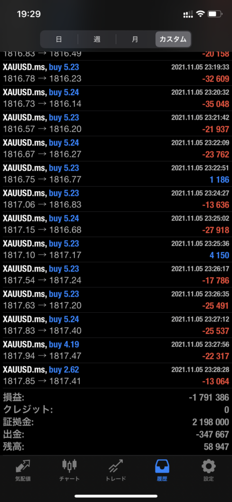履歴を見ると、俺が寝ている間に「XAUUSD(金)」の買い注文が数秒単位で連打され、一瞬にして資金が溶かされていた。